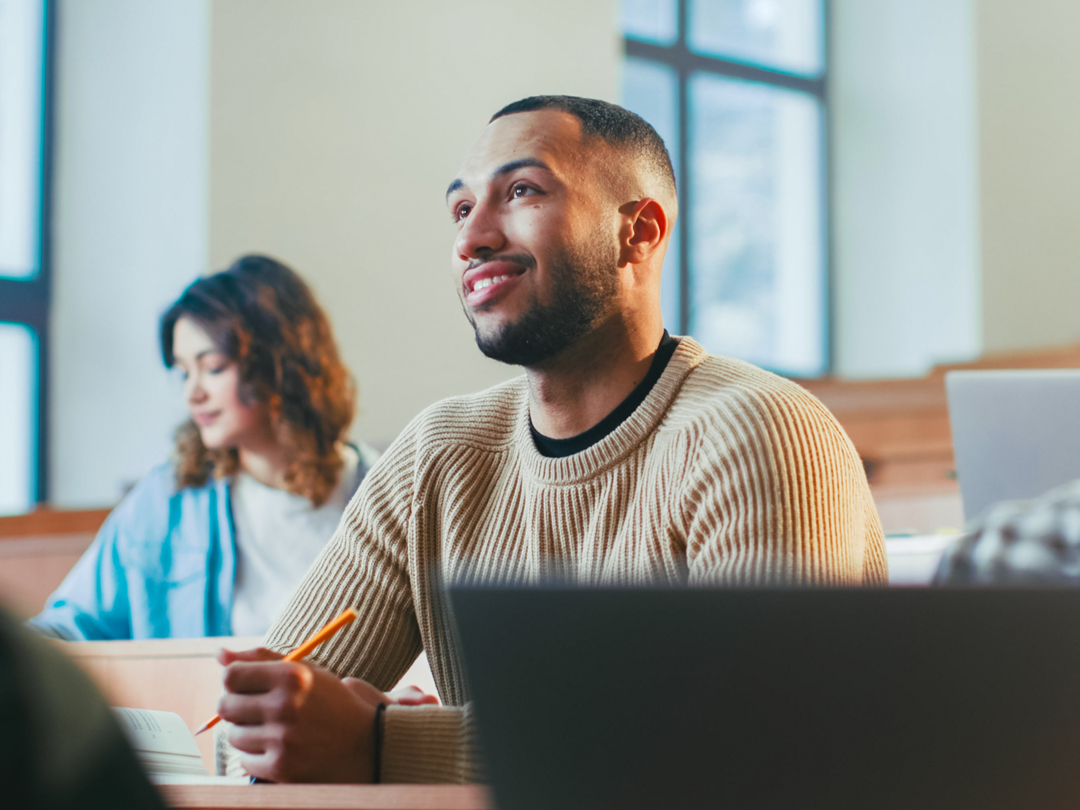 Ein Schüler sitzt in einem Klassenzimmer und hört aufmerksam dem Lehrer zu.