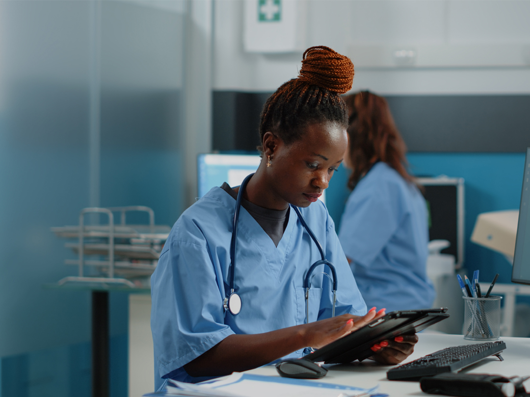 Eine Frau in medizinischer Kleidung bedient ein Tablet.