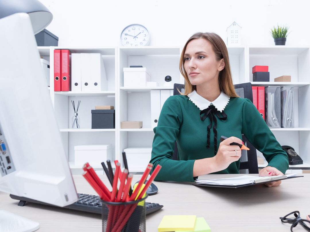 Eine schick gekleidete Frau in einem grünen Shirt sitzt an einem Schreibtisch vor einem Desktop im Büro.