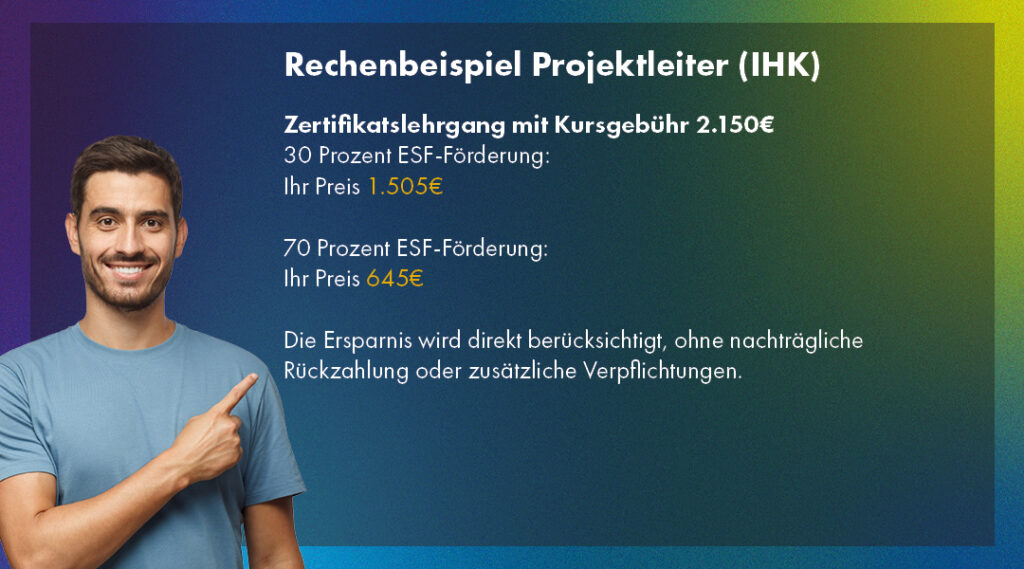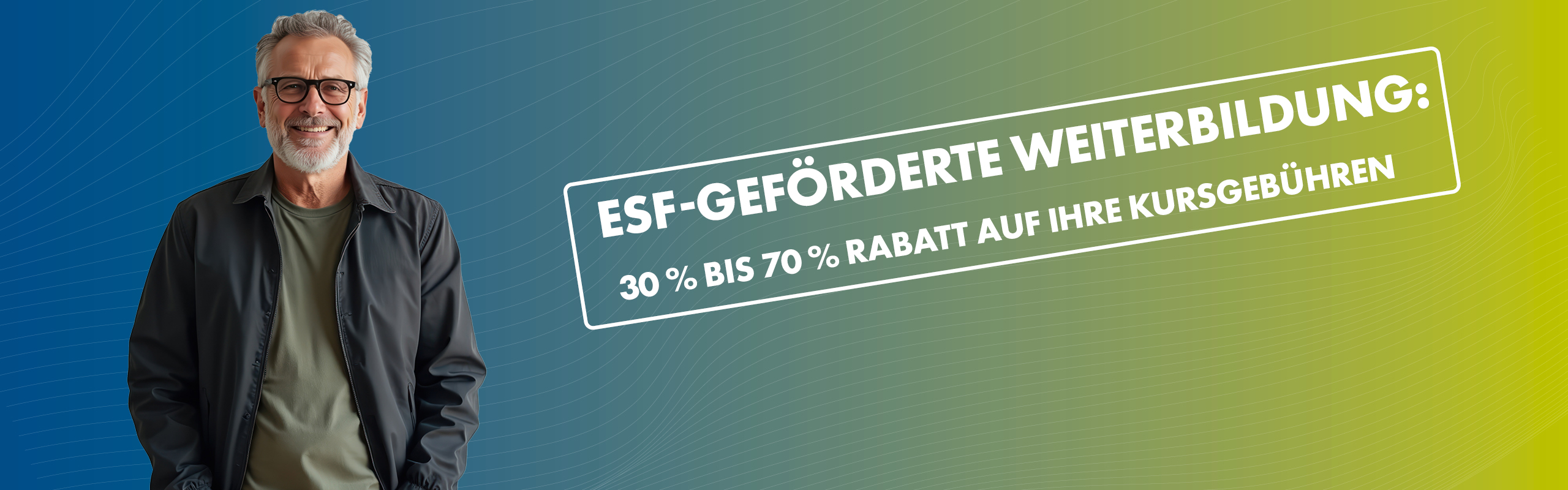 Die ESF-Förderung reduziert Ihre Kursgebühren um 30 Prozent. Für bestimmte Zielgruppen sind sogar bis zu 70 Prozent Förderung möglich, zum Beispiel für Teilnehmende ohne Berufsabschluss oder ab 55 Jahren. Ob eine Weiterbildung ESF-förderfähig ist, sehen Sie direkt bei der Kursbeschreibung auf unserer Webseite.